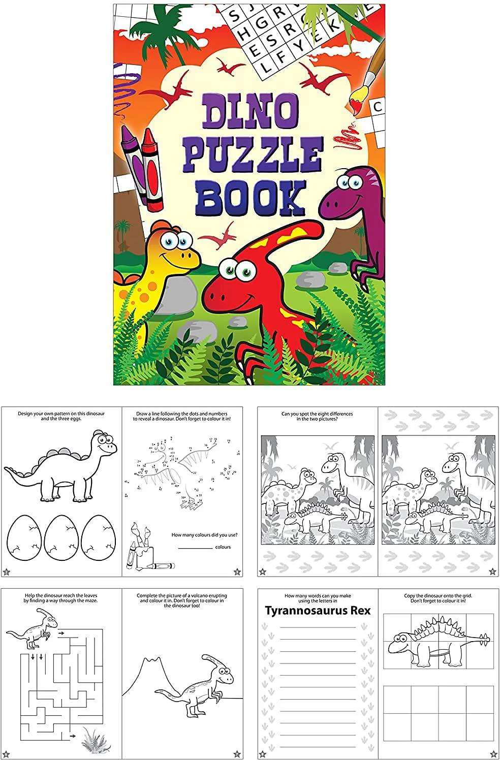 - 12 Dinosaur themed Fun Puzzle Activity Colouring Books. Each book contains 8 pages (16 sides) & the dimensions are 145 x 102mm. Each book contains 16 activities.
